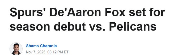 北京时间11月8日,据ESPN名记Shams在节目上透露,马刺队后卫福克斯将于北京时间周日对阵新奥尔良鹈鹕队的比赛中完成赛季首秀。