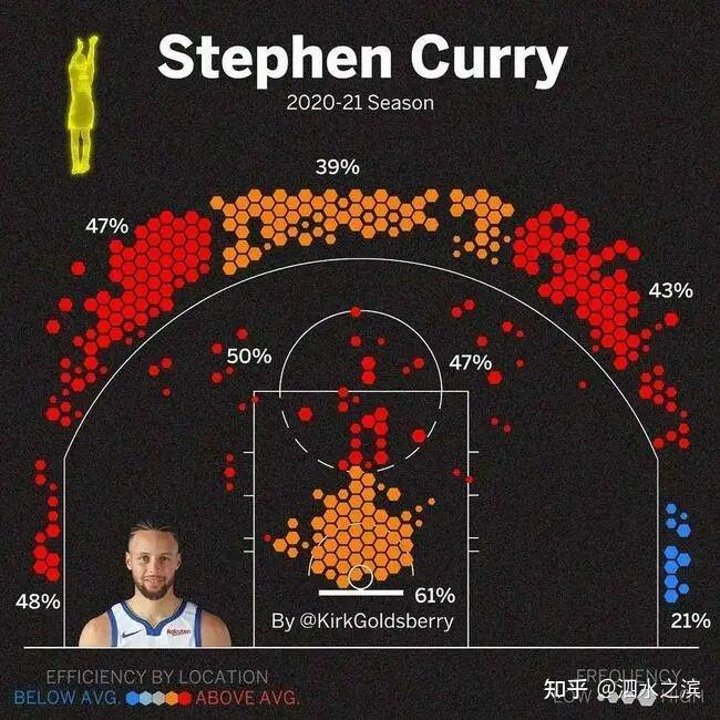 库里的得分大部分都来源于他的投篮,当然,包括变态的三分球。由上图可以看得出,库里大部分出手来自三分线外,中投可以说寥寥无几,但他的中投命中率却十分高,罚球线右侧高达50%,罚球线左侧47%。如果要评选中投王的话,从量产方面来说,乔丹堪称王者,但从命中率来说的话,库里堪称大哥。