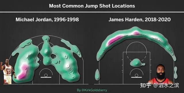 上图可以看出,乔丹时期,大部分球员还是愿意选择中投来终结,但越往后面,三分球的比重就不断提升。哈登 是一个怪胎,18-20两个赛季几乎全部出手来自三分线外,只有小部分出手在弧顶前面。这是历史潮流所致,不同时代有不同打法,无可厚非。
