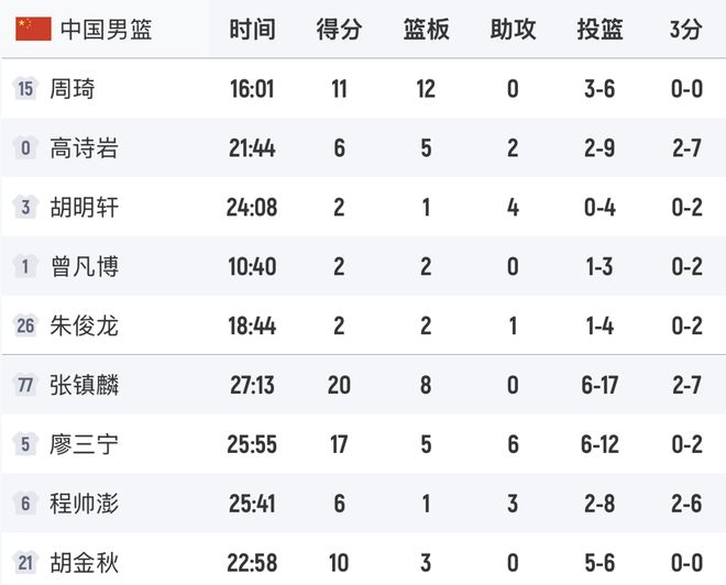 在首发阵容中,胡明轩4中0依靠罚球得2分,曾凡博3中1也是2分,另外朱俊龙投篮4中1同样只有2分进账。中国队的这3名先发队员打出这样的数据,输球也正常。