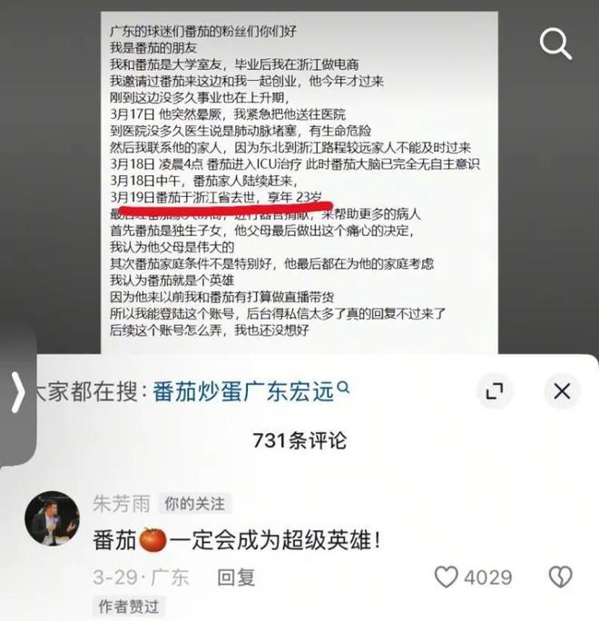 后来我们了解到番茄的故事,他是一名广东队球迷。曾在浙江做电商创业,当事业在上升期的时候突然遭遇变故。3月17日的时候番茄突然晕厥后被查出肺动脉堵塞,在3月18日凌晨4点进入ICU治疗,最后还是没能救回,于3月19日去世,享年23岁。